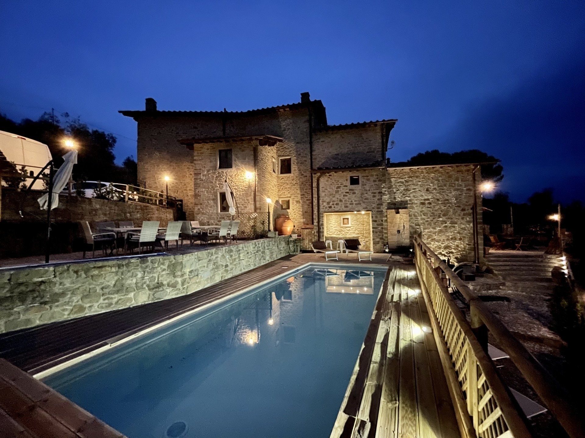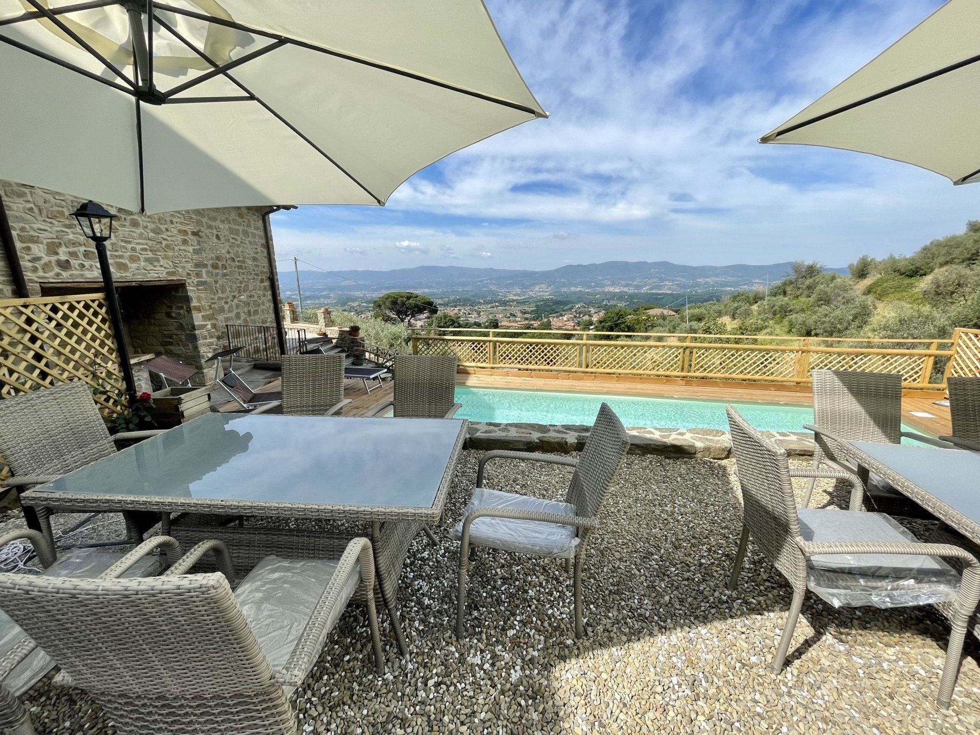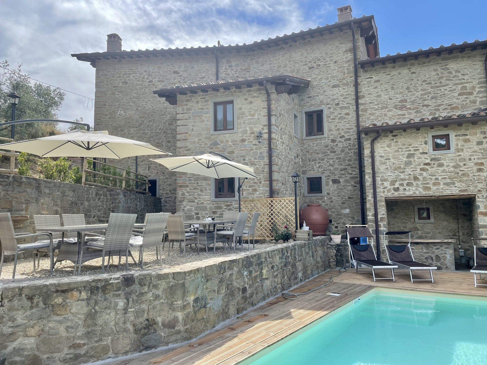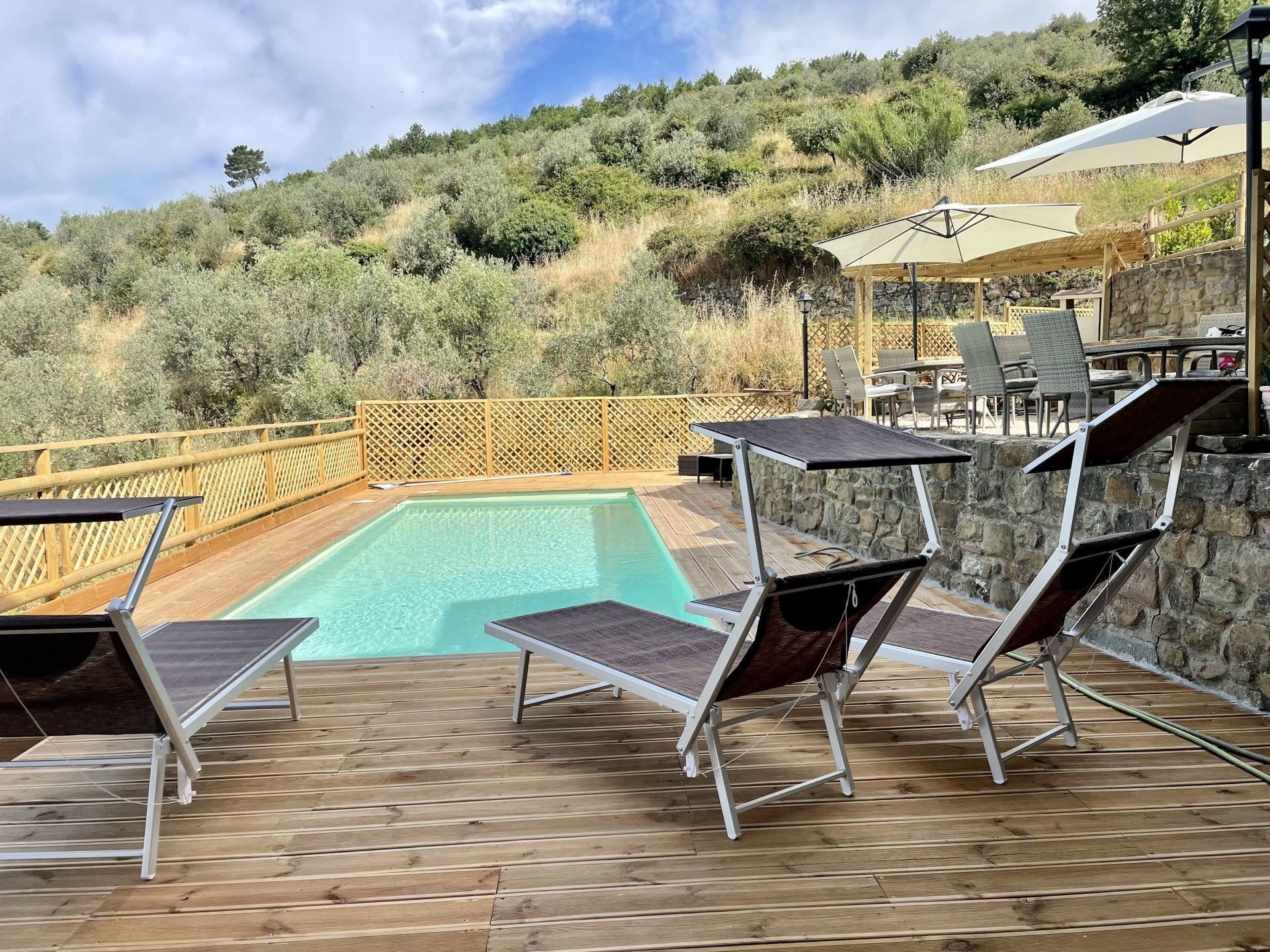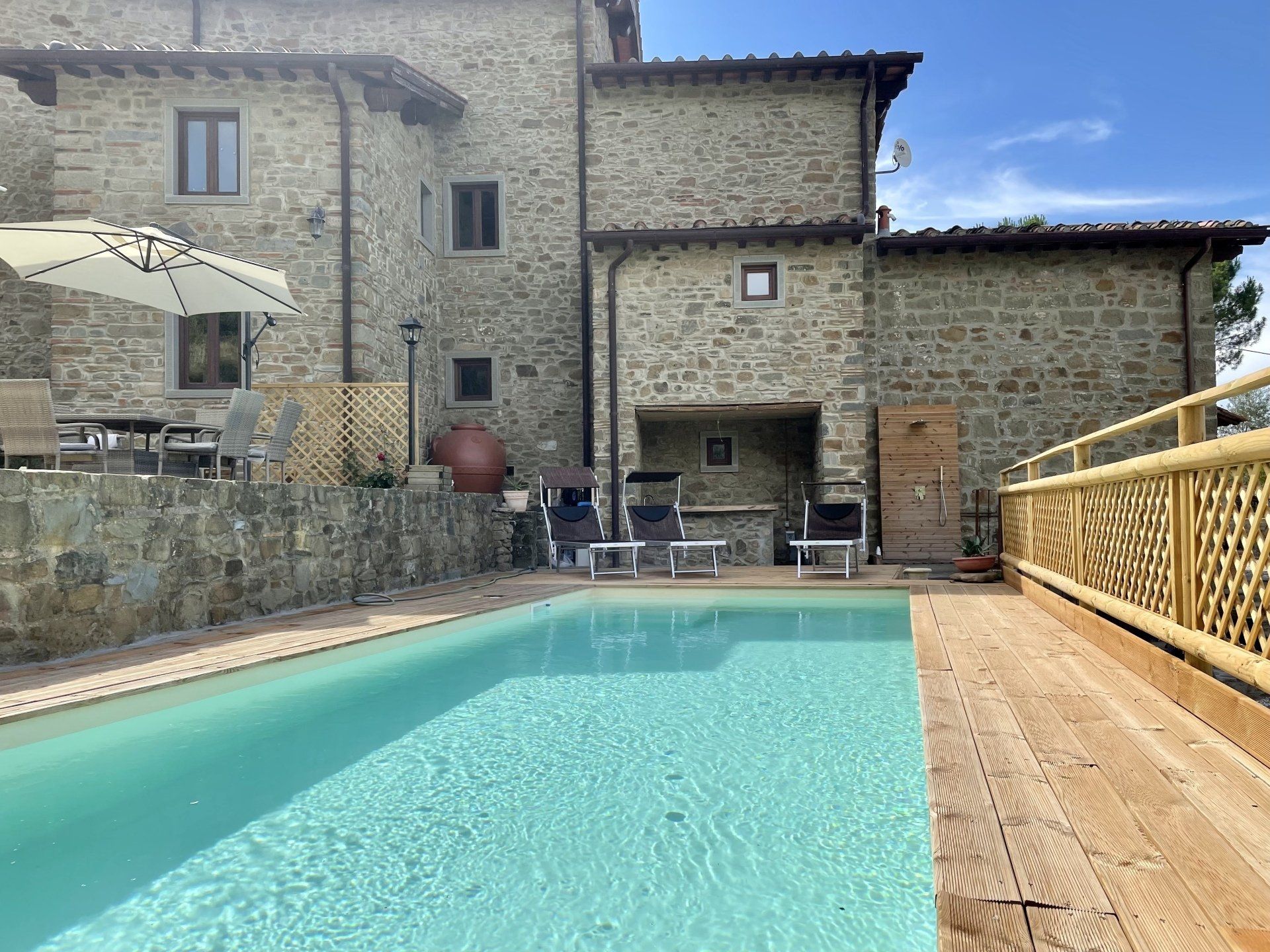 Patio per cenare all’aperto, doccia a cascata esterna , barbicure, terrazza panoramica, bar con ghiacciaia esterno alla piscina, piscina (attenzione in piscina è assolutamente vietato fare tuffi)